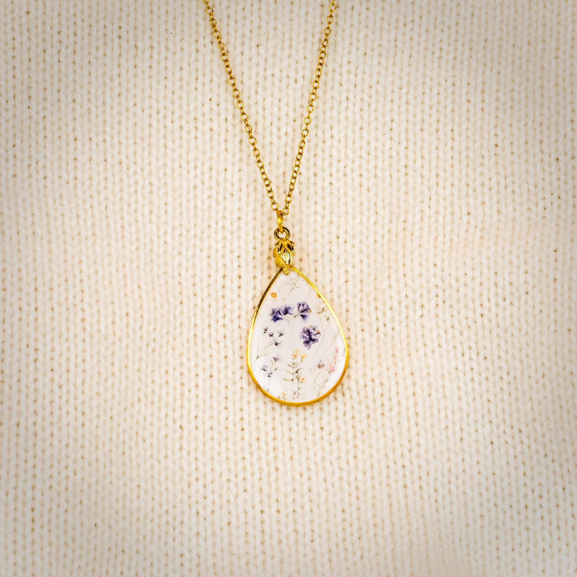 Eine zarte Halskette mit einem tropfenförmigen Anhänger mit Silvalooms charakteristischem Blumenwiesen-Futter, bekannt von unseren Schals und Ponchos. Der helle Hintergrund und das Blattgold-Detail am Anhänger unterstreichen den waldinspirierten Charakter der Marke, während die Kette und die hautnahen Elemente aus chirurgischem Stahl gefertigt sind – hypoallergen, langlebig und angenehm für den Alltag. Handgefertigt, eignet es sich perfekt für die Capsule Wardrobe oder als Geschenk für Naturliebhaber und Silvaloom-Handwerksliebhaber.