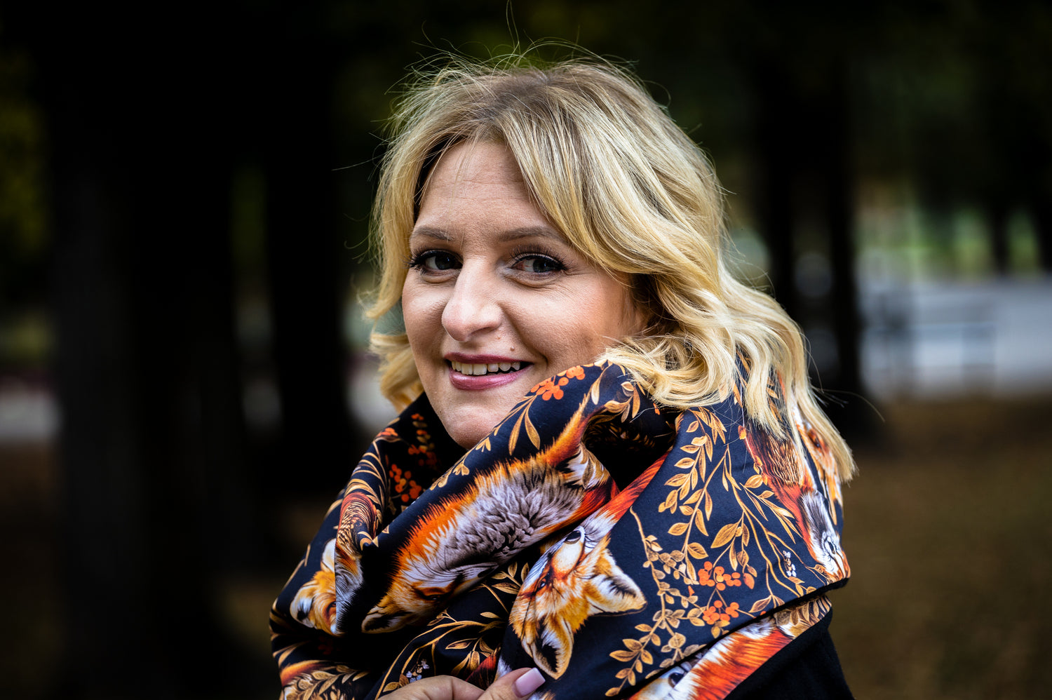 Elegant yet woodland-inspired, this wrap combines a deep black fleece with a fox-print interior against a dark background. Warm, soft, and comfortable to wear—perfect for cooler days when you want to feel stylish and cozy.