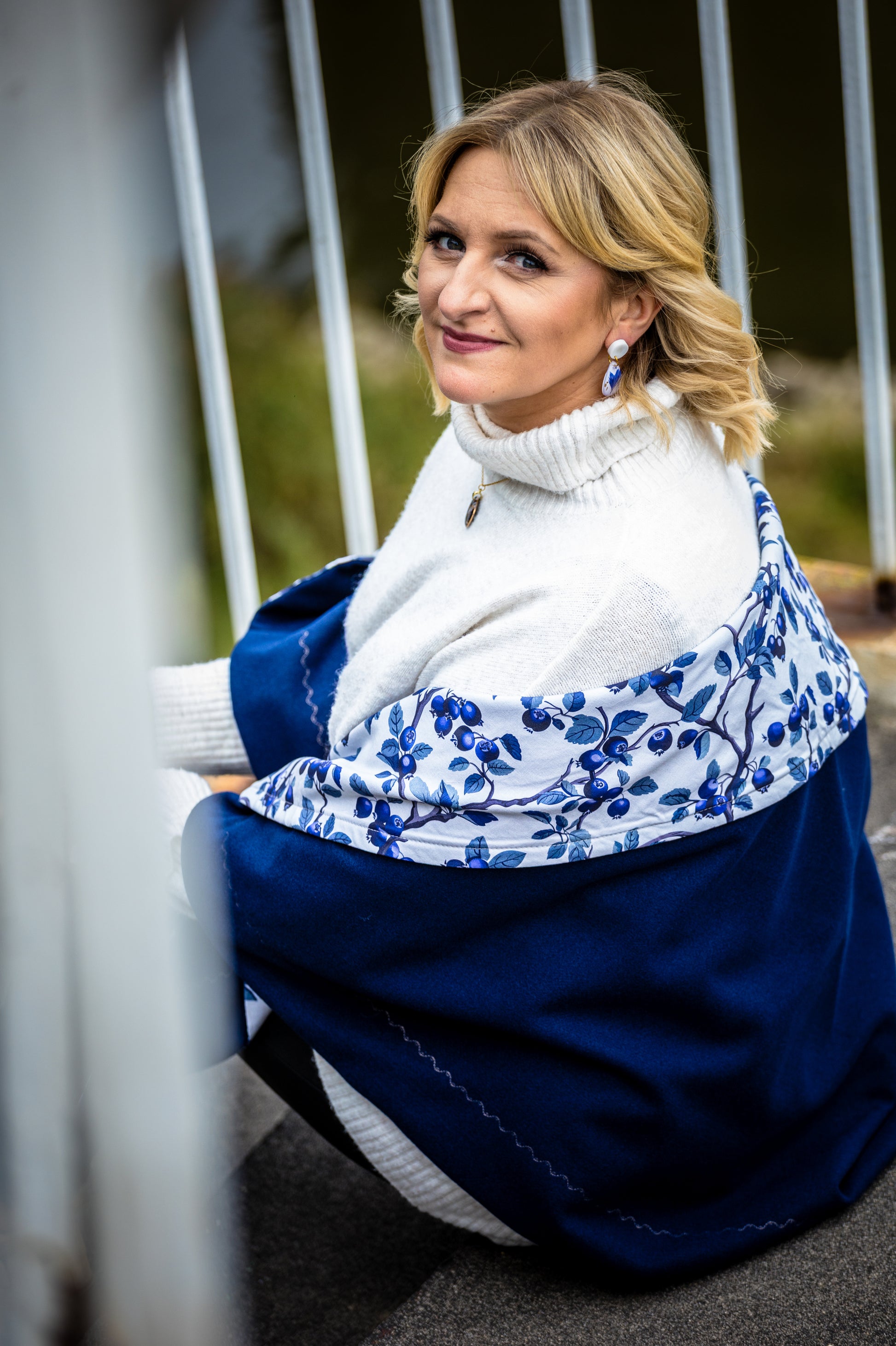 Meet "Blueberry Silence" – a wrap that exudes the tranquility of a forested retreat. The outer layer, made of soft fleece in a navy blue and black shade, envelops you in warmth, while the inner, printed cotton fabric captivates with a motif of tiny, dark berries against a light background.