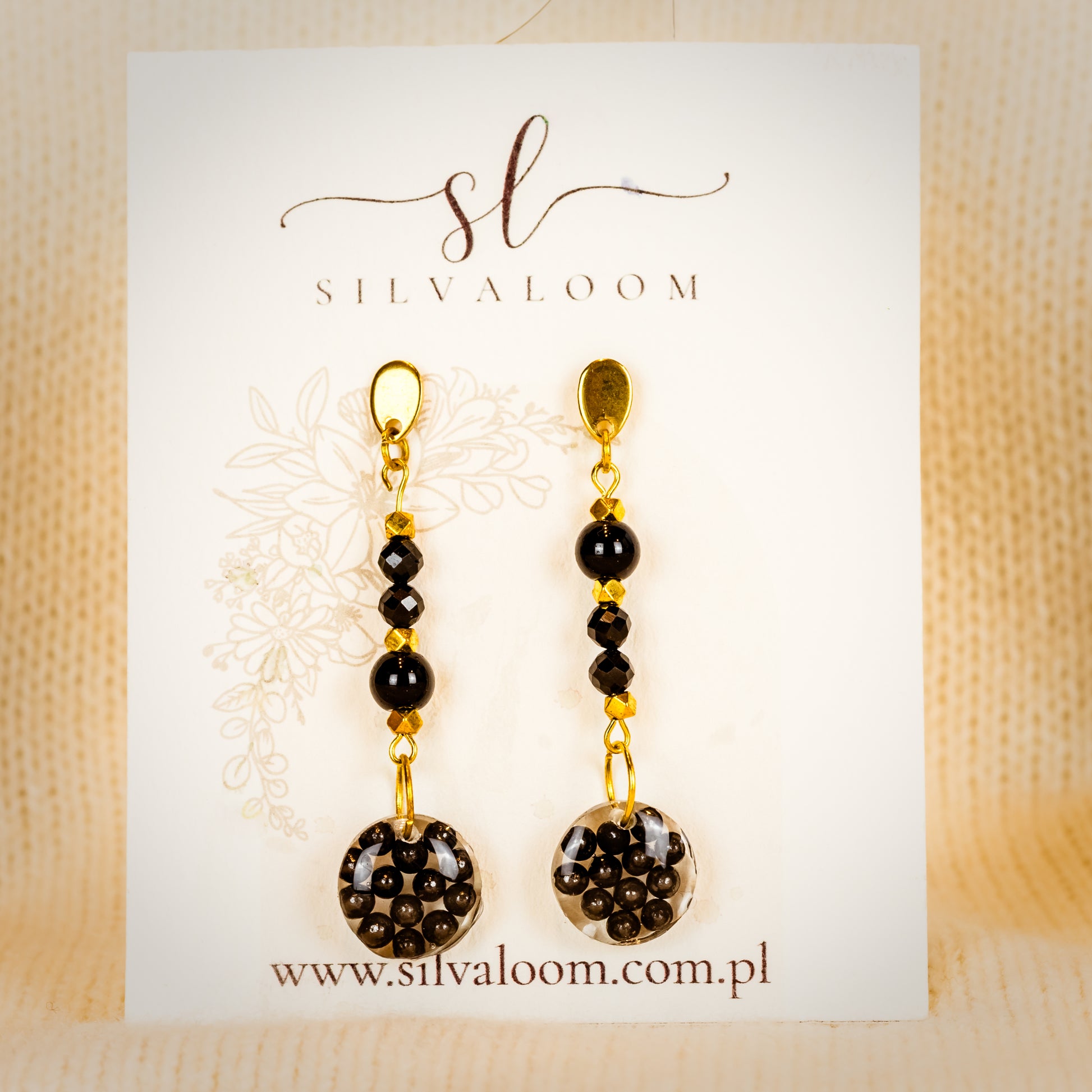 Wyraziste, wiszące kolczyki w leśnym stylu Silvaloom. Górę zdobi sekwencja czarnych koralików przeplatanych złotymi akcentami, a dół wieńczy okrągła zawieszka z przejrzystej żywicy z prawdziwym śrutem trwale zamkniętym w środku. To rzemieślnicza biżuteria z myśliwsko-outdoorową duszą: lekka, hipoalergiczna i wygodna dzięki stali chirurgicznej. Każda para jest unikatowa — układ śrutu może się różnić. Pielęgnacja: przecieraj miękką ściereczką, unikaj chemii i długiego kontaktu z wodą.