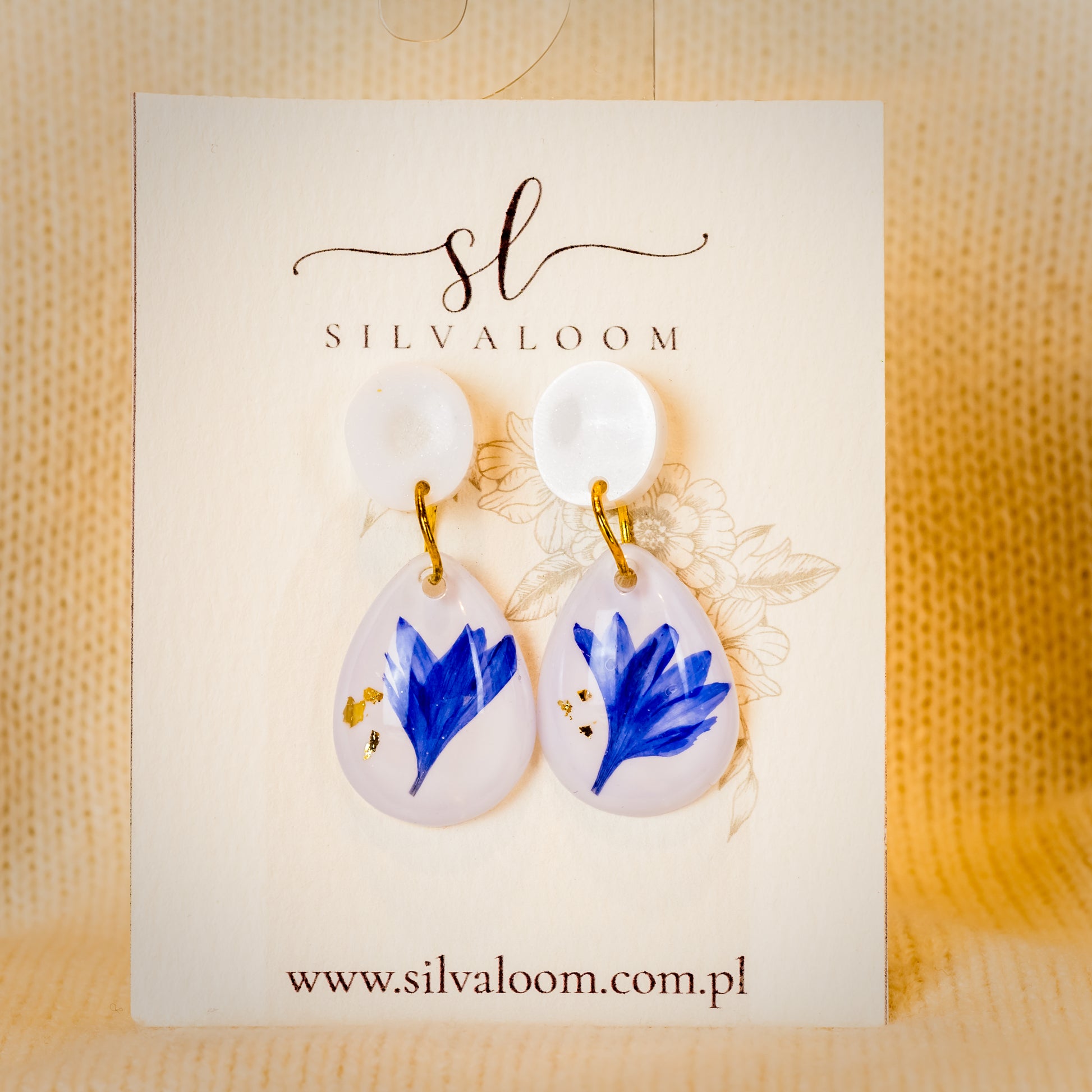 Delikatne kolczyki z mlecznobiałymi łezkami z przejrzystej żywicy. Wewnątrz – ręcznie malowany, błękitny motyw roślinny i subtelne złociste drobinki, które pięknie migoczą w ruchu. Sztyfty i elementy przy skórze wykonane są ze stali chirurgicznej, dzięki czemu model jest hipoalergiczny, lekki i wygodny na co dzień. Ręczne wykonanie sprawia, że każdy egzemplarz jest unikatowy – idealny do naturalnych, leśnych stylizacji Silvaloom.