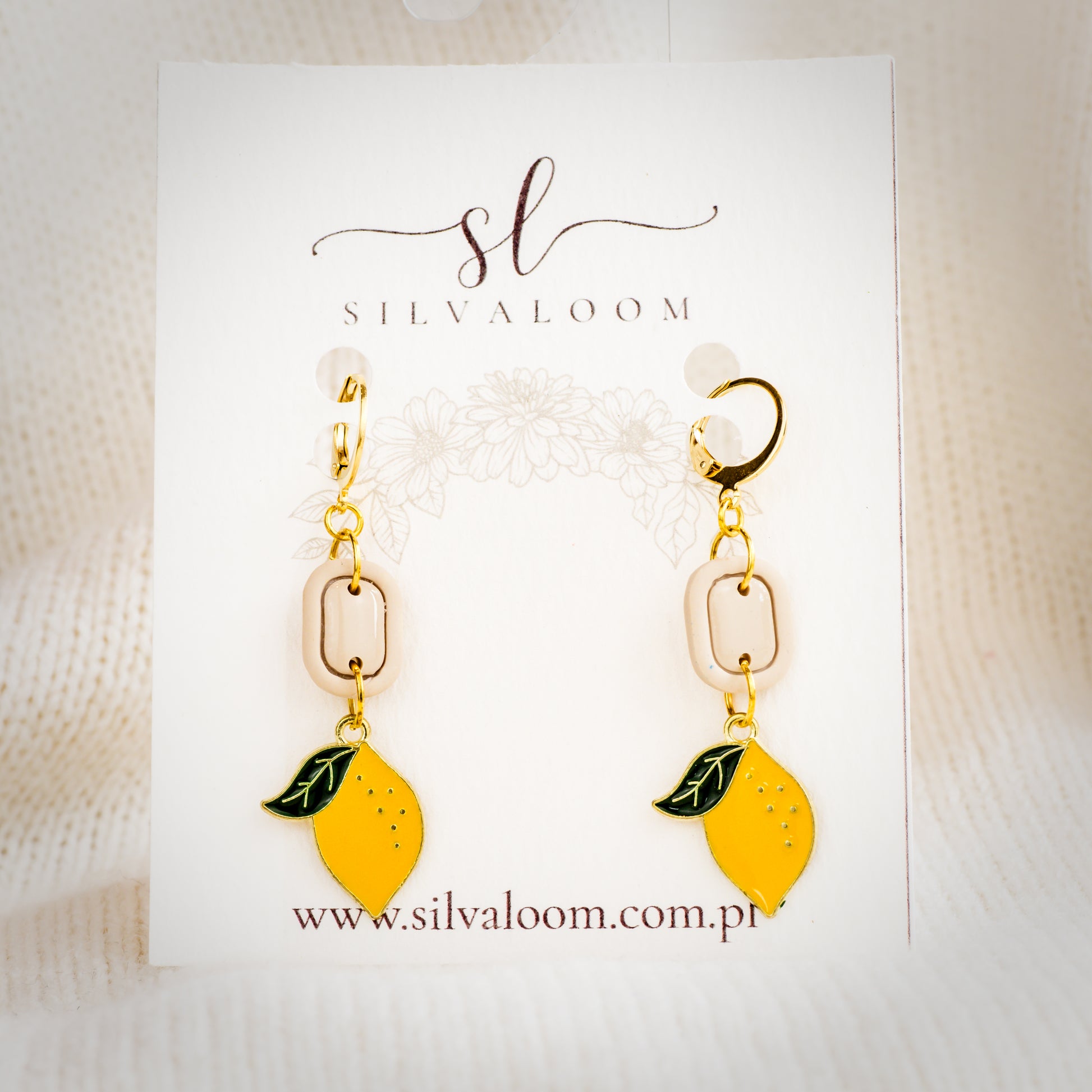 Letnie, lekkie kolczyki z emaliowanymi zawieszkami w kształcie cytryn. Połączone z nowoczesnym, beżowym ogniwem tworzą świeży, radosny akcent do codziennych stylizacji. Zapięcia typu bigiel angielski oraz elementy mające kontakt ze skórą są ze stali chirurgicznej – hipoalergiczne, trwałe i wygodne. Ręczna praca Silvaloom w naturalno-outdoorowym klimacie; idealne na wakacje, piknik czy spacer po lesie.