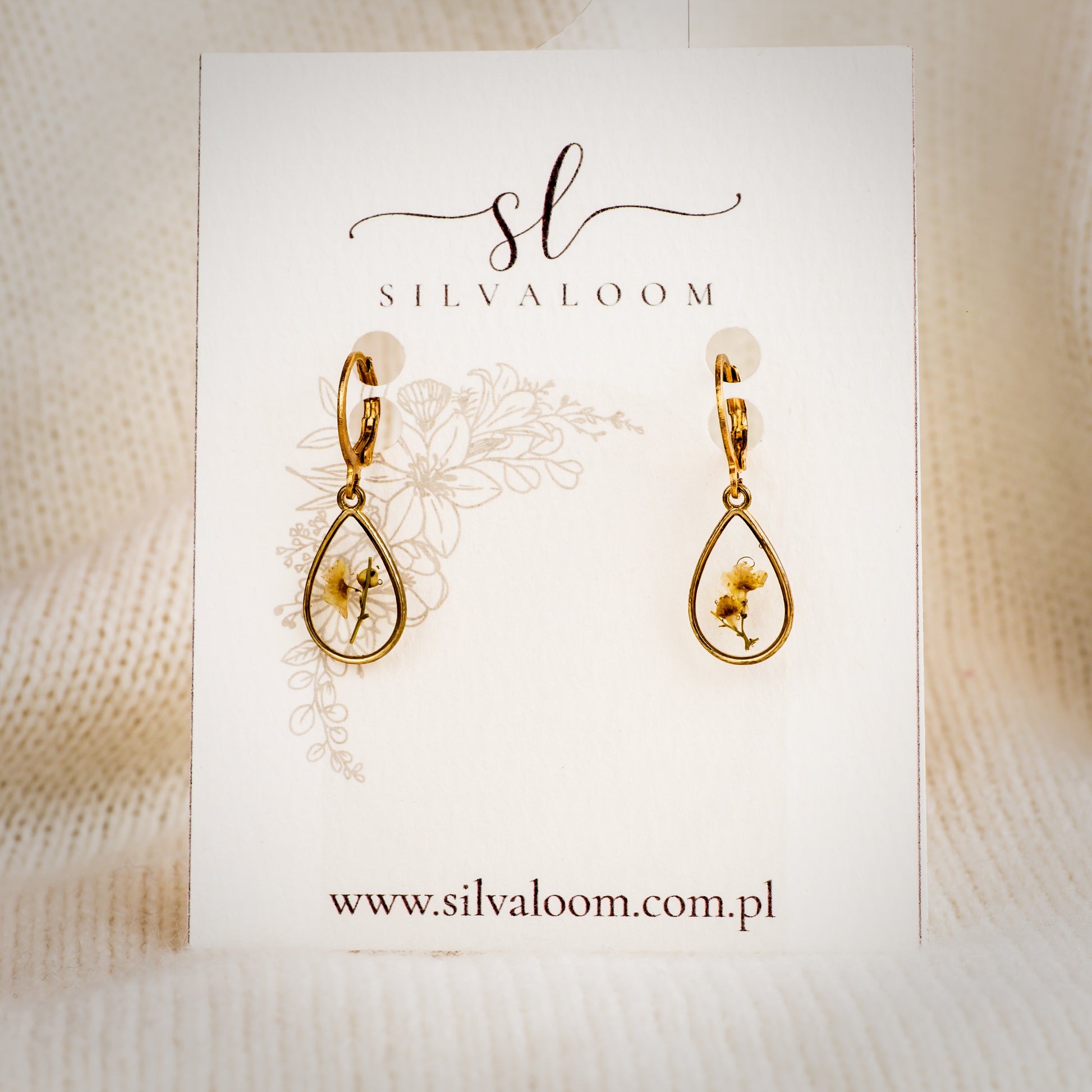 Delikatne kolczyki łezki z suszonymi kwiatami – złoty odcień, stal chirurgiczna | Silvaloom