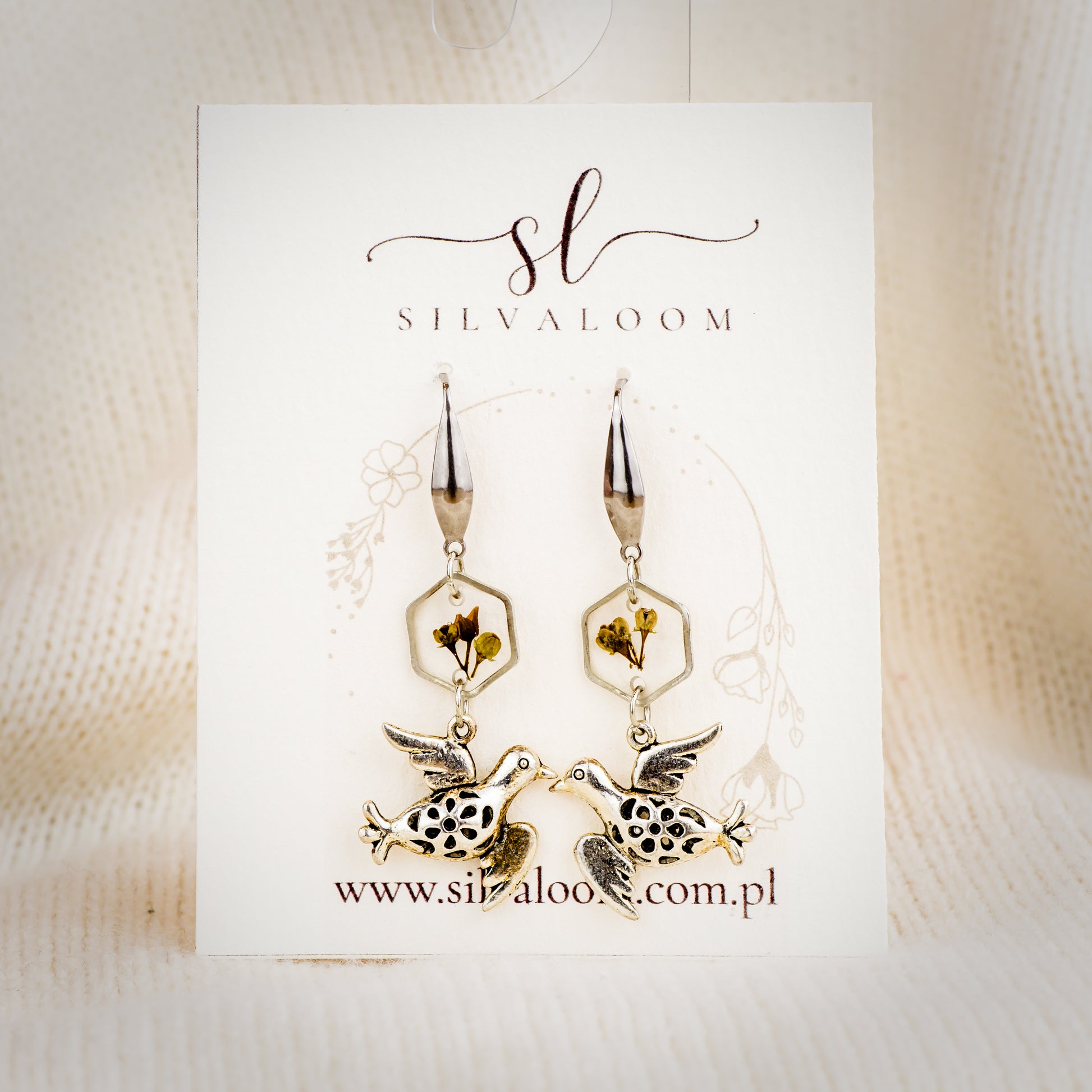 Kolczyki z ptakami i suszonymi roślinami – stal chirurgiczna | Silvaloom