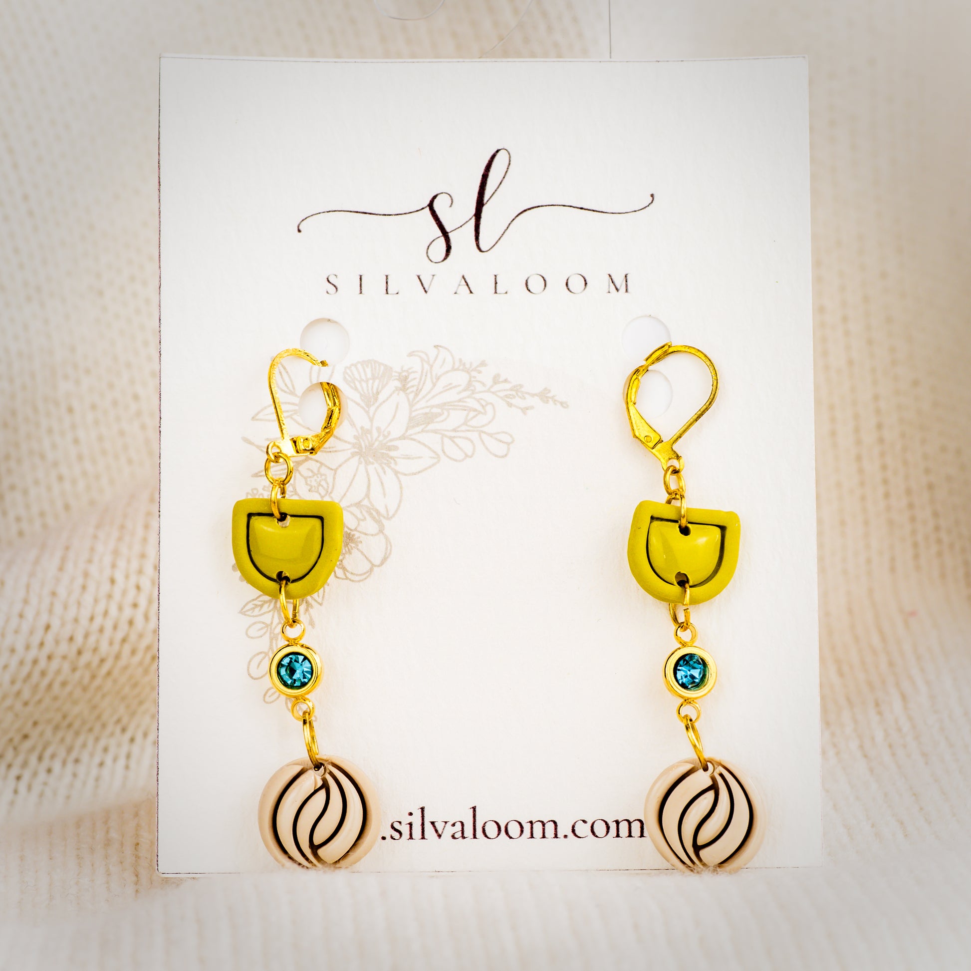 Lekkie, ręcznie robione kolczyki z glinki polimerowej w leśnym, limonkowym odcieniu z kremowym dyskiem o roślinnym motywie. Środkowy akcent stanowi błękitny kryształ, który dodaje subtelnego blasku. Elementy mają złoty odcień, a części stykające się ze skórą wykonane są ze stali chirurgicznej – hipoalergiczne, trwałe i wygodne w codziennym noszeniu. To rzemieślnicza biżuteria w klimacie natury i ogniska: oryginalna, a przy tym uniwersalna do kapsułowej garderoby. Każda para powstaje ręcznie, dlatego układ i odcienie mogą delikatnie się różnić. Pielęgnacja: czyść miękką ściereczką, unikaj chemii i długiego kontaktu z wodą, nie zginaj elementów z glinki; przechowuj w lnianym woreczku.