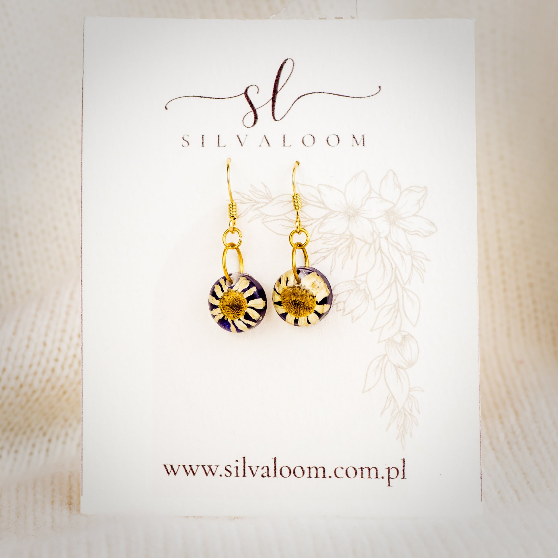 Delikatne, lekkie kolczyki z małymi, okrągłymi zawieszkami, w których zatopione są naturalne suszone kwiaty na głębokim, fioletowym tle. Złoty odcień elementów podkreśla ciepło leśnej palety, a stal chirurgiczna jest hipoalergiczna i odporna na codzienne użytkowanie. Każda para powstaje ręcznie, dlatego układ płatków jest niepowtarzalny. To minimalistyczna biżuteria leśna, która pasuje do kapsułowej garderoby i wieczorów przy ognisku. Pielęgnacja: przecieraj miękką ściereczką; unikaj chemii i długiego kontaktu z wodą; przechowuj w lnianym woreczku.