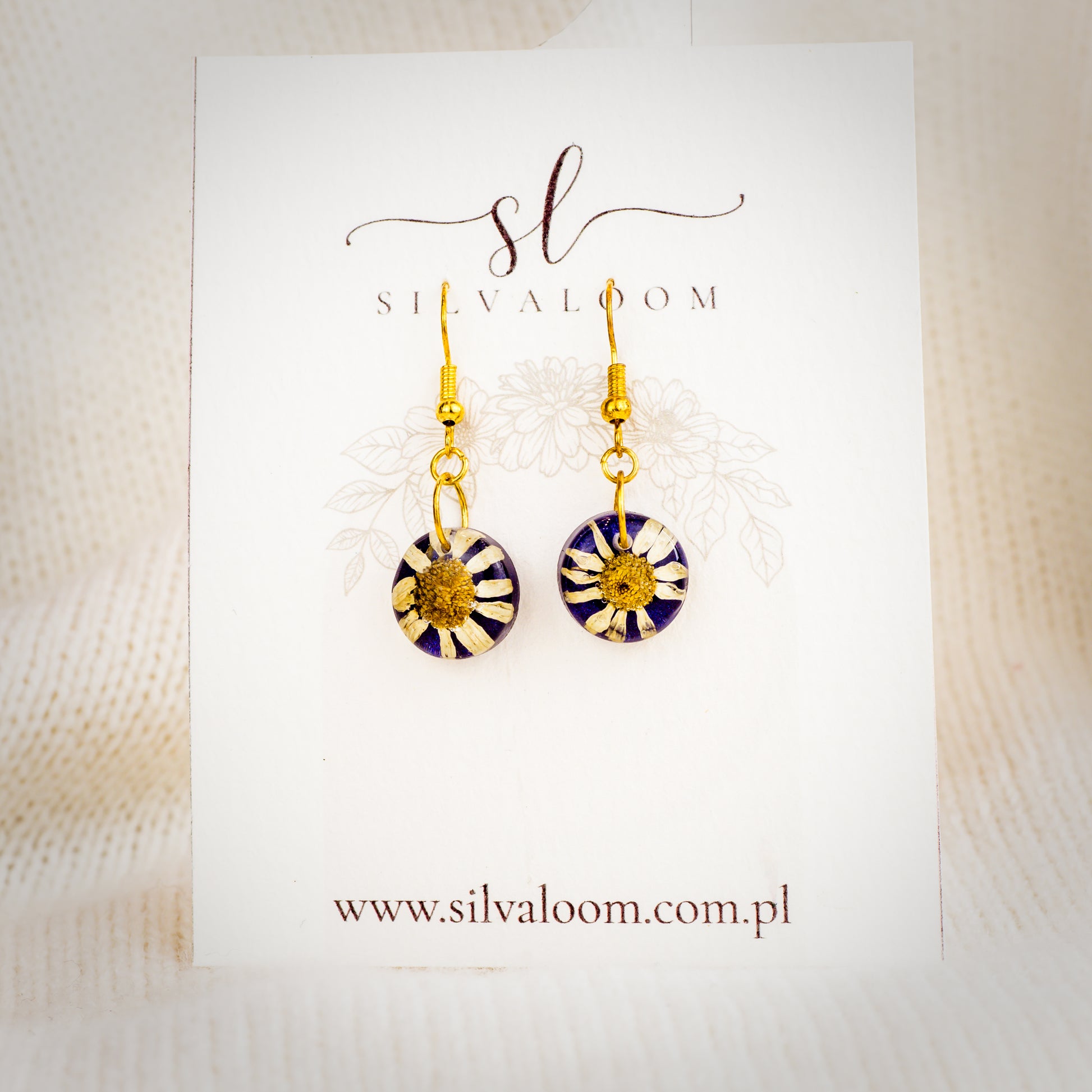 ęcznie robione kolczyki z okrągłymi zawieszkami w głębokim granacie, w których zatopione są naturalne, suszone kwiaty. Złoty odcień elementów ociepla całość, a stal chirurgiczna jest hipoalergiczna, trwała i wygodna na co dzień. Każda para jest unikatowa – idealna do kapsułowej garderoby w leśnym stylu i na wieczorne wyjścia przy ognisku. Pielęgnacja: przecieraj miękką ściereczką, unikaj chemii i długiego kontaktu z wodą; przechowuj w lnianym woreczku.