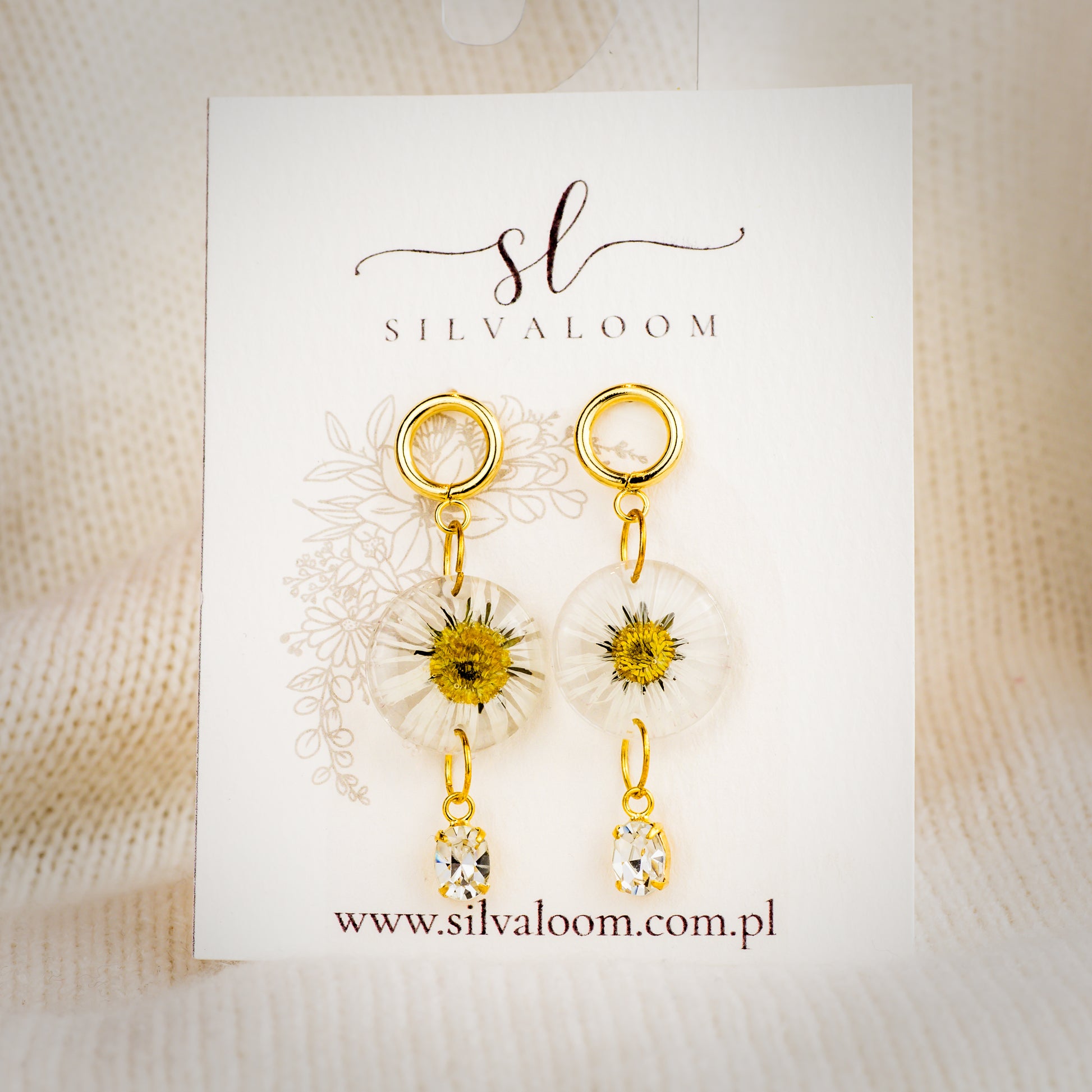 Ręcznie robione kolczyki ze stali chirurgicznej w złotym odcieniu. Przejrzysta, okrągła zawieszka z żywicy skrywa naturalny, suszony kwiat, a u dołu połyskuje szlifowany, bezbarwny kryształ. Model jest hipoalergiczny, lekki i wygodny w codziennym noszeniu; łączy leśną estetykę z prostą elegancją. Każda para jest unikatowa dzięki ręcznemu wykonaniu i niepowtarzalnemu układowi roślin. Idealne do kapsułowej garderoby i na wieczory przy ognisku. Pielęgnacja: przecieraj miękką ściereczką, unikaj chemii i długiego kontaktu z wodą; przechowuj w lnianym woreczku.