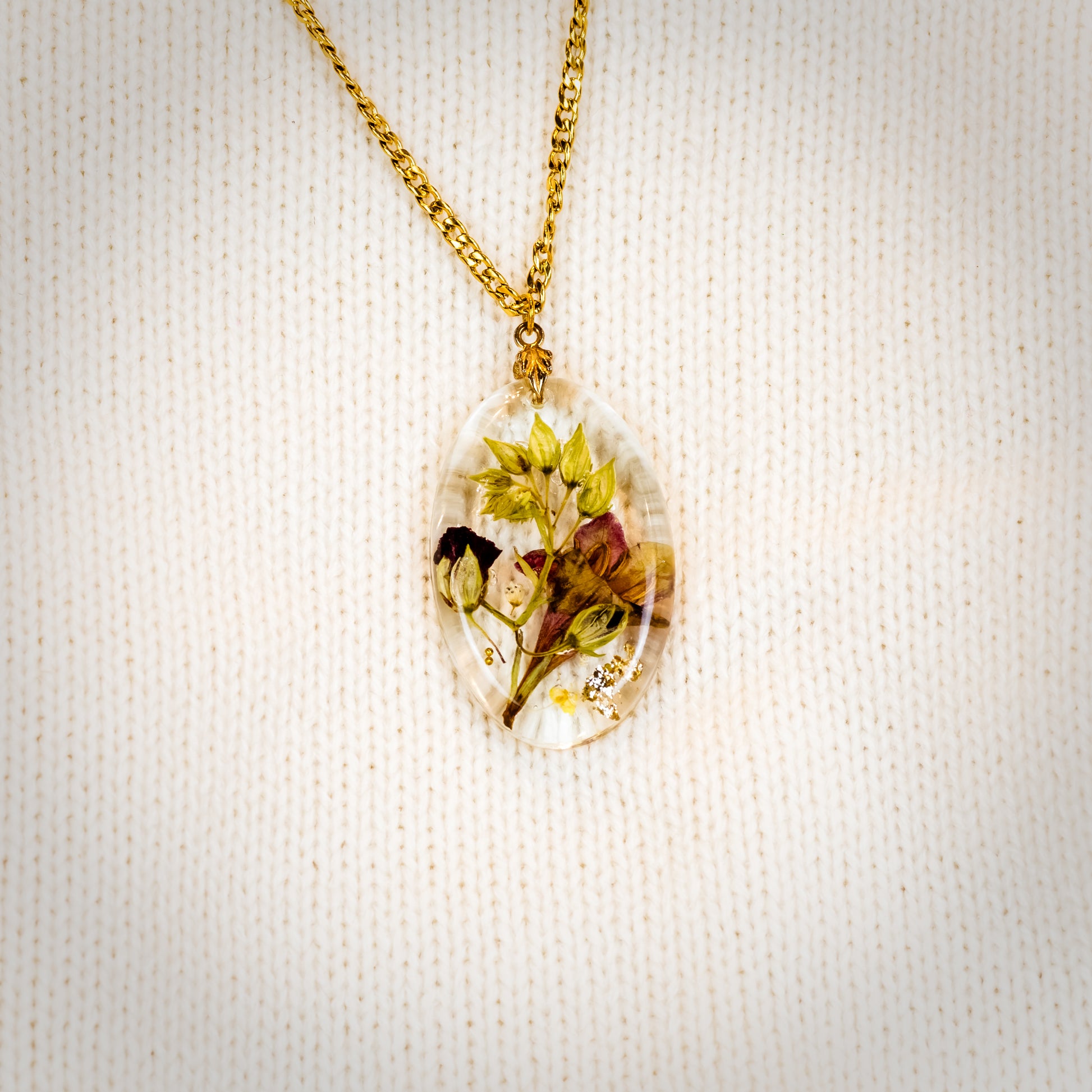 Naszyjnik owalny z suszonymi roślinami i złocistymi płatkami – stal chirurgiczna | Silvaloom