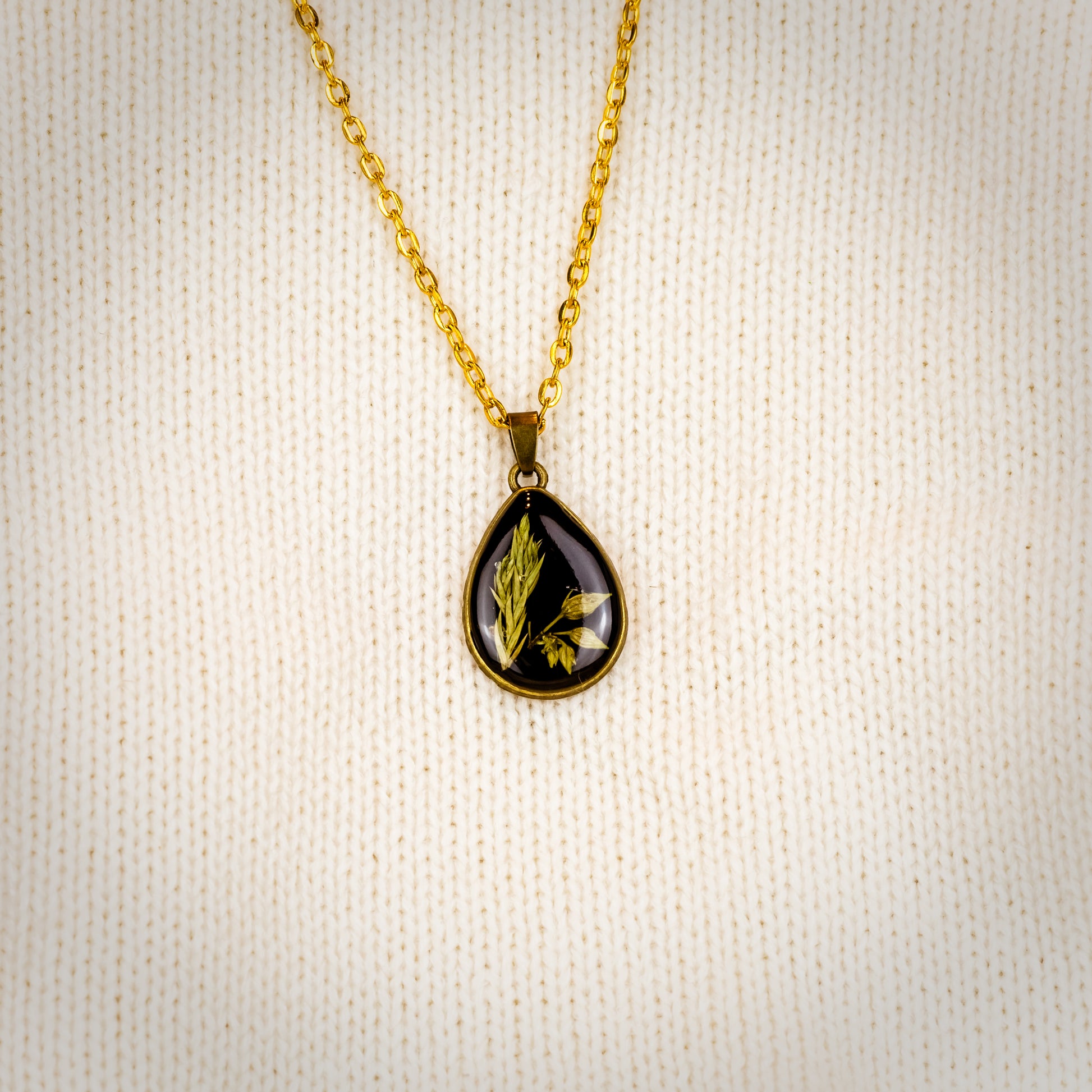 Naszyjnik łezka z suszoną trawą na czarnym tle – stal chirurgiczna, antyczne złoto | Silvaloom