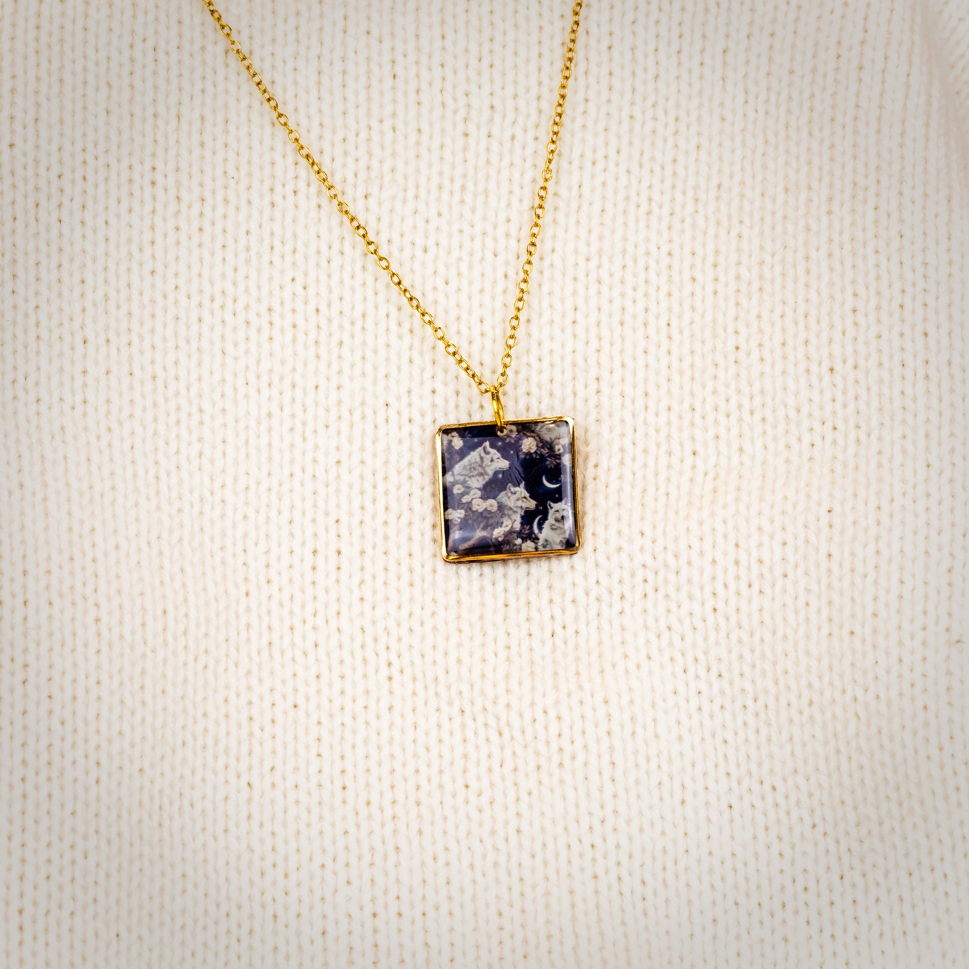 Kwadratowy medalion w leśnym klimacie Silvaloom: ilustracja wilków na ciemnym tle z motywem księżyca i roślin zamknięta pod przejrzystą, szklistą powłoką. Złota oprawa i łańcuszek ze stali chirurgicznej są hipoalergiczne, trwałe i wygodne w noszeniu. Ręcznie składany wisiorek z myśliwsko-outdoorową duszą — wyrazisty, a jednocześnie elegancki. Idealny do kapsułowej garderoby i jako prezent dla miłośniczek natury.