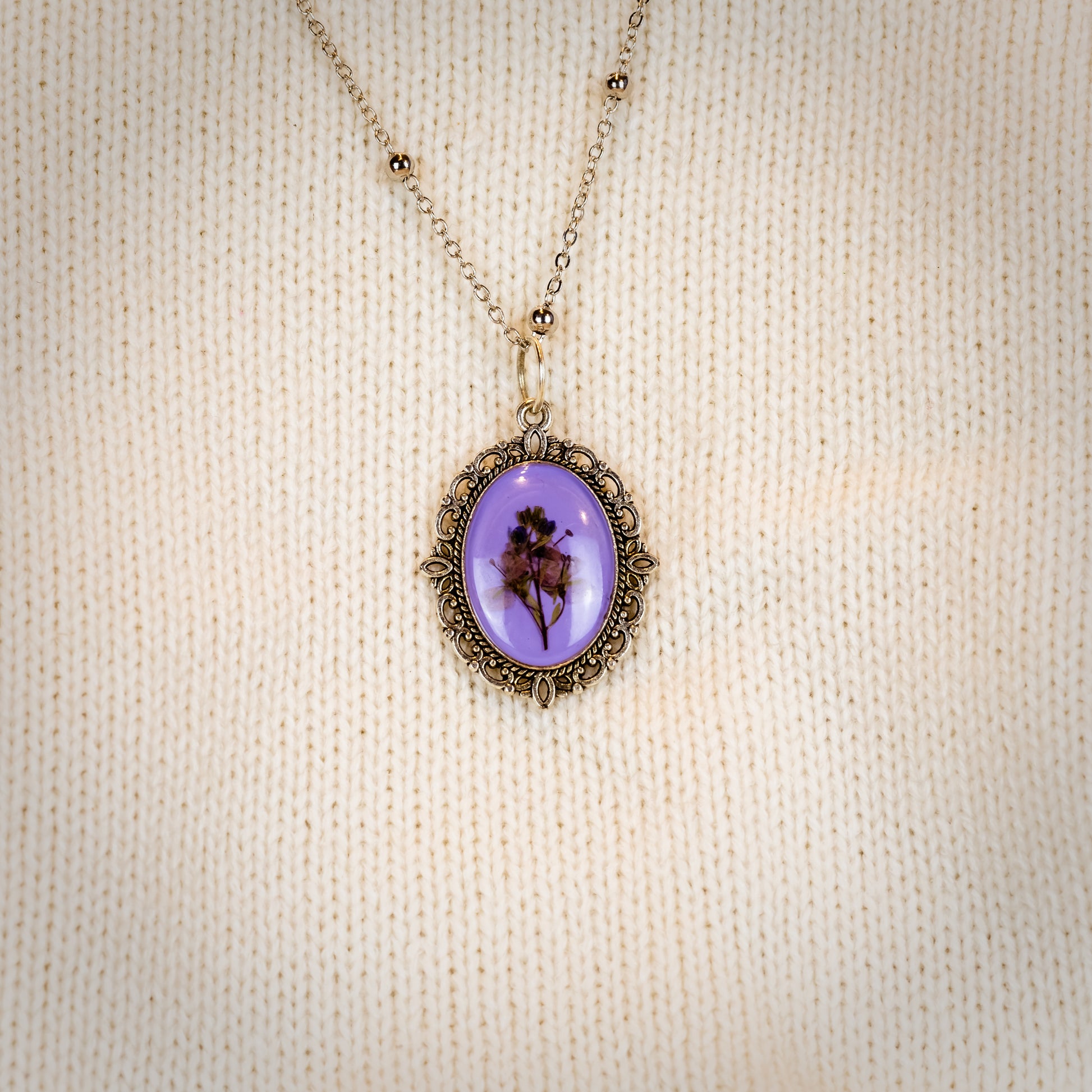 Naszyjnik owalny vintage z suszonym kwiatem na lawendowym tle – antyczne złoto, stal chirurgiczna | Silvaloom