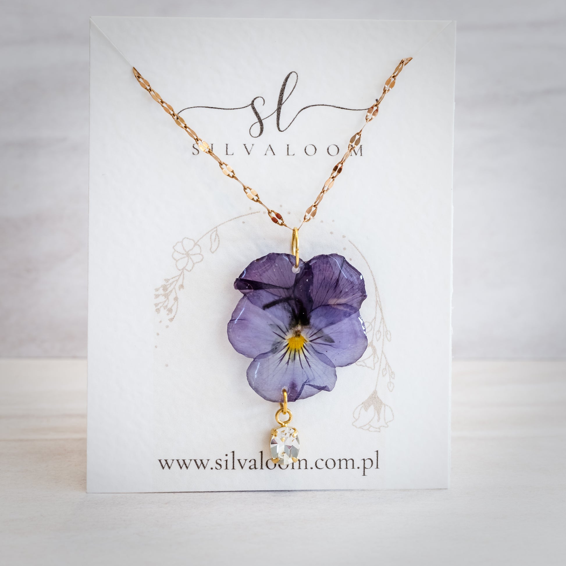 Delikatny jak szept poranka: prawdziwy bratek utrwalony w żywicy i muśnięty kroplą światła – kryształem, który porusza się przy każdym Twoim kroku. Ten naszyjnik powstał z myślą o kobietach, które lubią mieć przy sercu mały talizman spokoju i odwagi. Naturalny, romantyczny, a jednocześnie wyrazisty – do swetra, białej koszuli i sukienki „na wyjątkowe”.