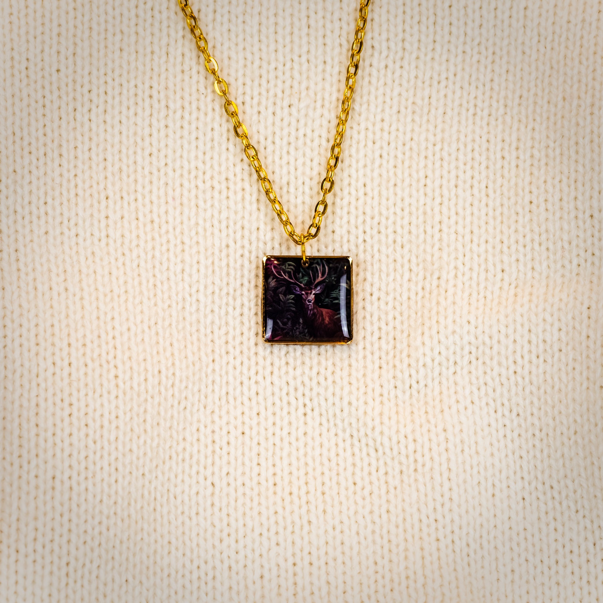Naszyjnik Jeleń – kwadratowy medalion z żywicy, złoty | stal chirurgiczna | Silvaloom