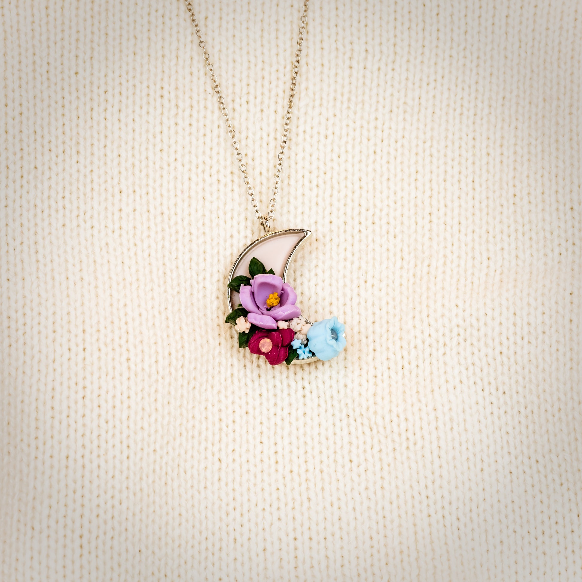 Naszyjnik „Księżyc” z kwiatami z glinki polimerowej – stal chirurgiczna | Silvaloom