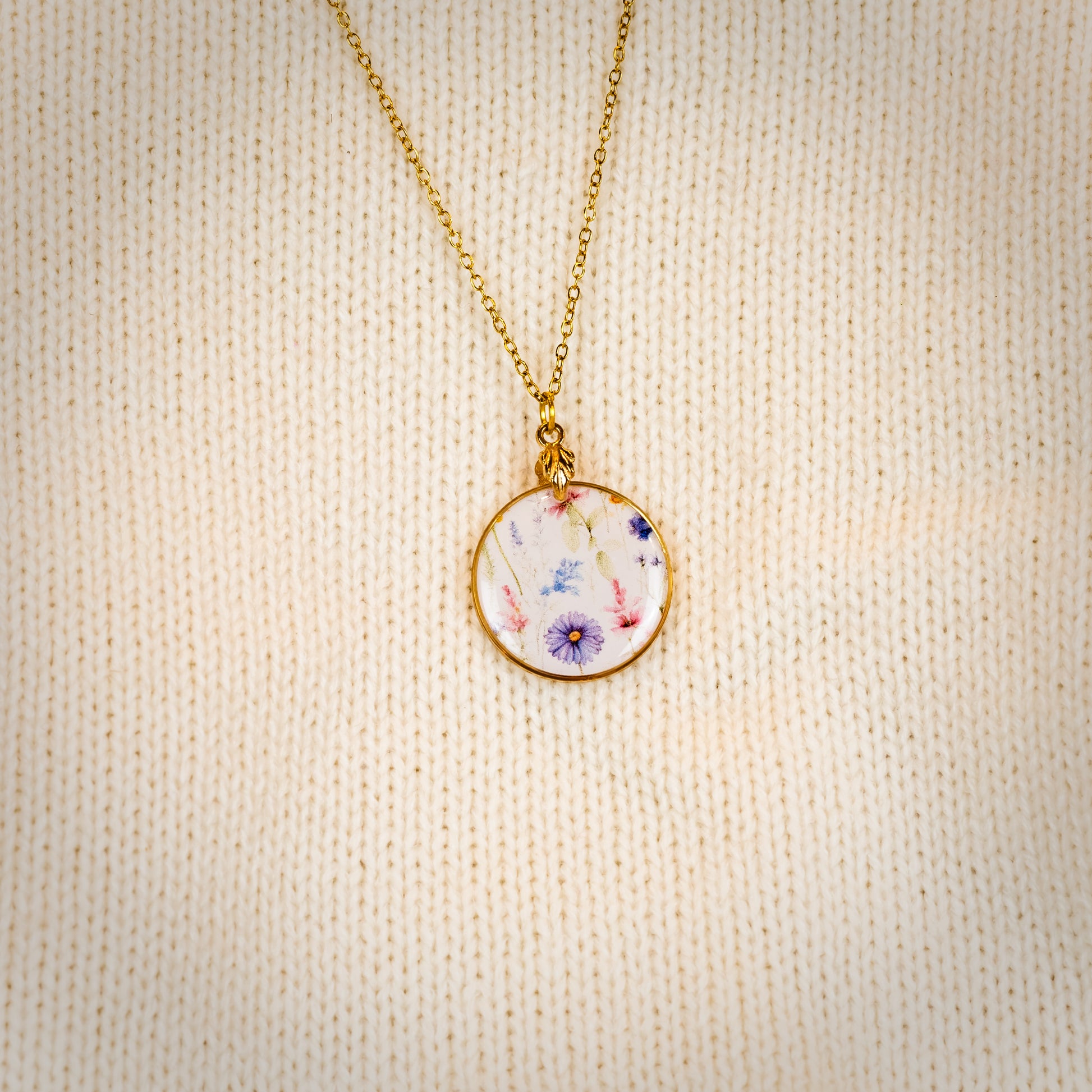 Delikatny medalion z okrągłą zawieszką prezentującą autorski wzór podszewki Silvaloom (ten sam motyw, który zdobi nasze chusty i poncha). Jasne tło i roślinne akcenty tworzą lekki, leśny charakter, a złoty listek przy zawieszce dodaje subtelnej elegancji. Łańcuszek i elementy przy skórze wykonane są ze stali chirurgicznej – hipoalergiczne, trwałe i wygodne na co dzień. Ręcznie składany, uniwersalny dodatek do kapsułowej garderoby i świetny pomysł na prezent dla miłośniczek natury i rzemiosła Silvaloom.
