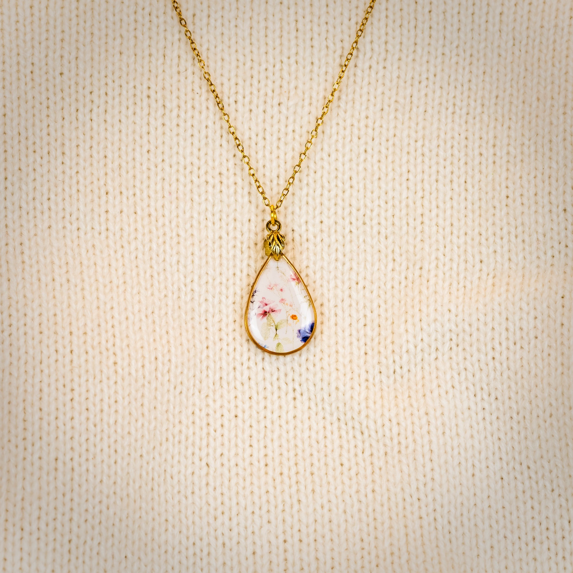 Delikatny wisiorek w kształcie łezki z autorskim wzorem podszewki Silvaloom (ten sam motyw, który zdobi nasze chusty i poncha). Jasne tło i roślinne akcenty nadają lekkości, a złoty listek przy zawieszce podkreśla leśny charakter marki. Łańcuszek i elementy przy skórze wykonane są ze stali chirurgicznej – hipoalergiczne, trwałe i wygodne w codziennym noszeniu. Ręcznie składany, uniwersalny dodatek do kapsułowej garderoby i świetny pomysł na prezent dla miłośniczek natury i rzemiosła.