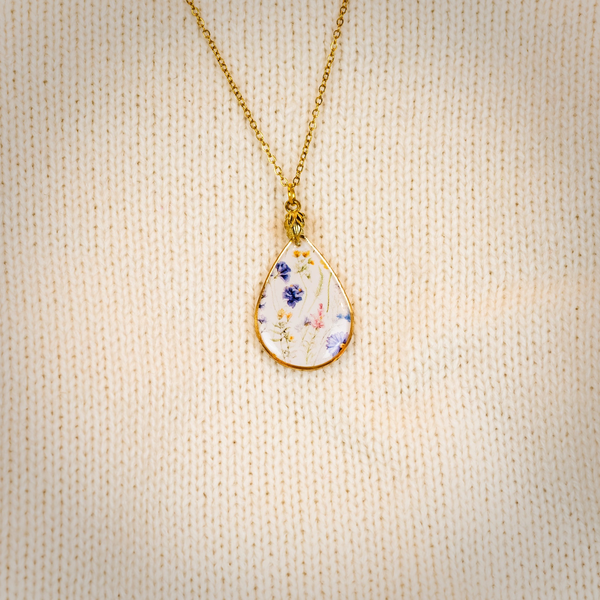 Naszyjnik łezka łąka z autorskim wzorem podszewki – stal chirurgiczna, złoty odcień | Silvaloom